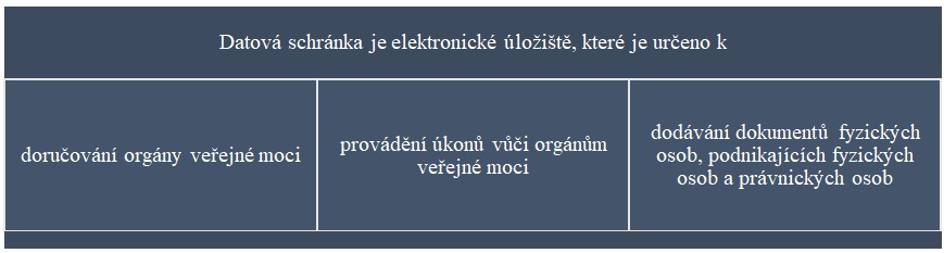 Osobě, která má zpřístupněnu datovou schránku, se podle § 42 DŘ doručuje elektronicky podle jiného právního předpisu. V poznámce pod čarou je ve zmíněném ustanovení odkazováno na zákon o elektronických úkonech. Konkrétně jde o doručování prostřednictvím datové schránky. Definice datové schránky je obsažena v § 2 odst. 1 ZEÚ.