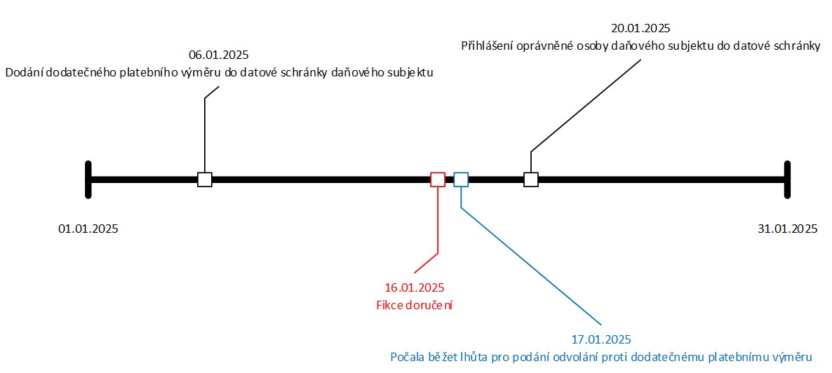 Správce daně vydal dne 6. 1. 2025 dodatečný platební výměr na daň z přidané hodnoty, který byl ještě téhož dne dodán do datové schránky daňového subjektu. Oprávněná osoba daňového subjektu se do datové schránky přihlásila dne 20. 1. 2025. Vzhledem k tomu, že posledním dnem desetidenní lhůty byl den 16. 1. 2025, došlo k tomuto dni podle ustanovení § 17 odst. 4 zákona o elektronických úkonech k fikci doručení. Dne 17. 1. 2025 počala běžet lhůta podle § 109 odst. 4 DŘ pro podání odvolání proti dodatečnému platebnímu výměru.