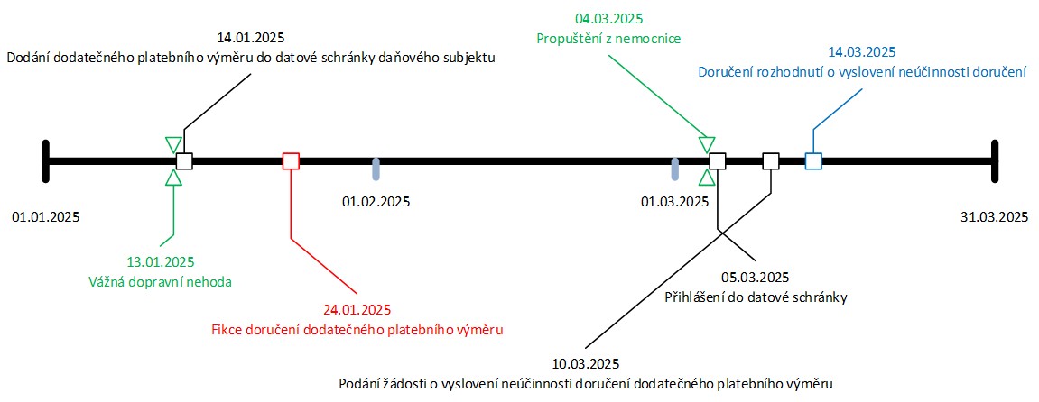 Správce daně vydal dne 14. 1. 2025 dodatečný platební výměr, který byl ještě téhož dne dodán do datové schránky daňového subjektu, podnikající fyzické osoby. Dne 13. 1. 2025 však měla tato osoba vážnou dopravní nehodu, a proto se nemohla přihlásit do datové schránky, a to ani v zákonem stanovené desetidenní lhůtě. S ohledem na uvedenou skutečnost nastala fikce doručení dne 24. 1. 2025. Dne 4. 3. 2025 byla zmíněná osoba (dále jen "daňový subjekt") propuštěna z nemocnice a dne 5. 3. 2025 se přihlásila do datové schránky, přičemž zjistila, že jí byl dne 14. 1. 2025 dodán dodatečný platební výměr, u něhož nastala fikce doručení dne 24. 1. 2025. Daňový subjekt proto dne 10. 3. 2025 podal prostřednictvím datové schránky žádost o vyslovení neúčinnosti doručení podle § 48 DŘ, ve vazbě na § 17 odst. 5 ZEÚ, neboť se ze závažného a nepředvídatelného důvodu nemohl přihlásit do datové schránky a uplynula mu tak lhůta pro podání odvolání. K podané žádosti daňový subjekt přiložil záznam Policie České republiky o dopravní nehodě a zprávu z nemocnice. Správce daně, s ohledem na důvody podané žádosti a přiložené listiny dokládající tvrzení daňového subjektu o nemožnosti přihlásit se do datové schránky, shledal žádost důvodnou a dne 13. 3. 2025 vydal rozhodnutí o vyslovení neúčinnosti doručení předmětného dodatečného platebního výměru. Rozhodnutí o vyslovení neúčinnosti doručení bylo dodáno do datové schránky daňového subjektu dne 12. 3. 2025 a doručeno dne 14. 3. 2025. Za doručený tak byl dodatečný platební výměr považován dnem 14. 3. 2025.